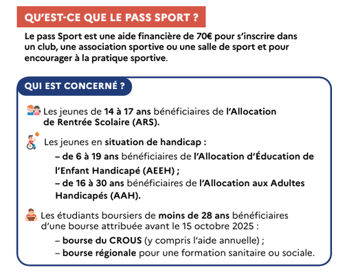 Le Pass’Sport est une aide de 70 € destinée à favoriser la pratique sportive des jeunes.